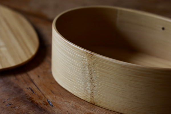 竹にじっくりと熱を加えながら美しい小判型に仕上げる「わっぱ弁当箱」。節によって強度が異なる竹の性質を熟知した職人だけが表現できる均一なフォルムは唯一無二の造形美。引っかかりもなく驚くほど滑らかな仕上がりが特徴です。