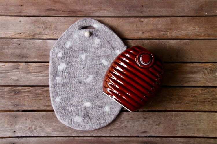 フェルトの中でも合成繊維が入っていない天然ウール100%のフェルトカバーなので保温性抜群。やわらかく肌触りもいいので冷えた体にぴったりフィットし、じんわり温めてくれます。