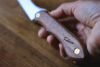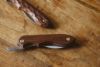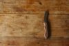 ナイフの柄はウォルナット材を使用しております。ひとつひとつ木目の表情や色味が異なりますが天然木の風合いとしてお楽しみください。
