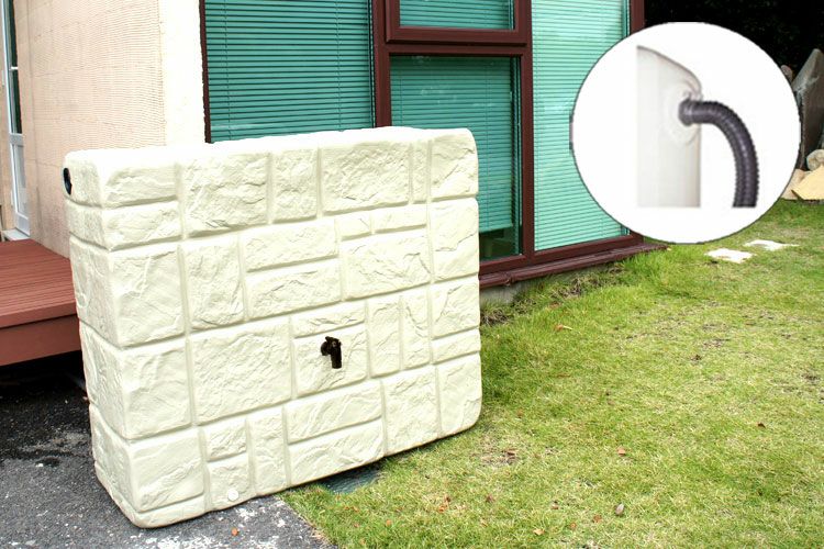 天然石を積み上げたようなデザインのウォールタンクはおよそ約300リットルの雨水を貯留できる大容量の雨水タンクです。ガーデニングを始め、災害時などの生活用水、さまざまな用途にお使いいただけます。