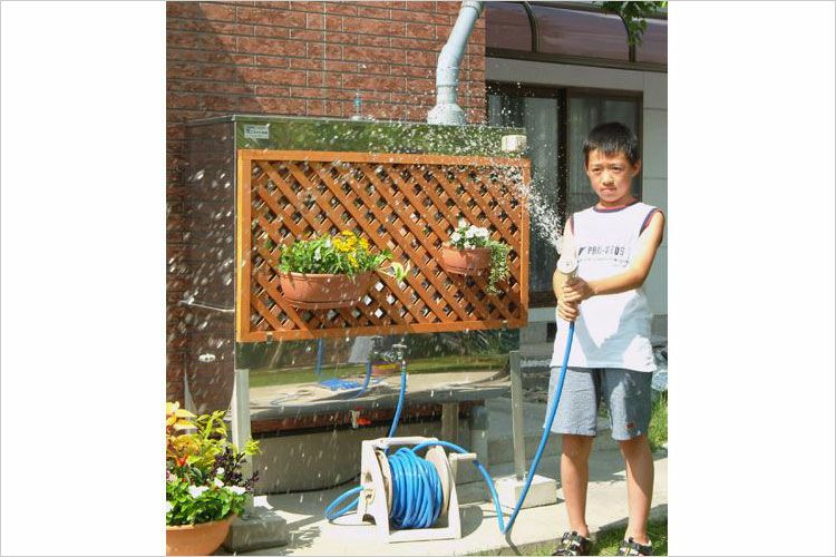 雨ニティー500リットルはステンレス製でウッドパネルが装備。おしゃれなお庭にぴったりのデザインです。加圧ポンプが内蔵されていて洗車や散水に最適です。また災害時の補助水や防火水槽としてもお使いいただけます。